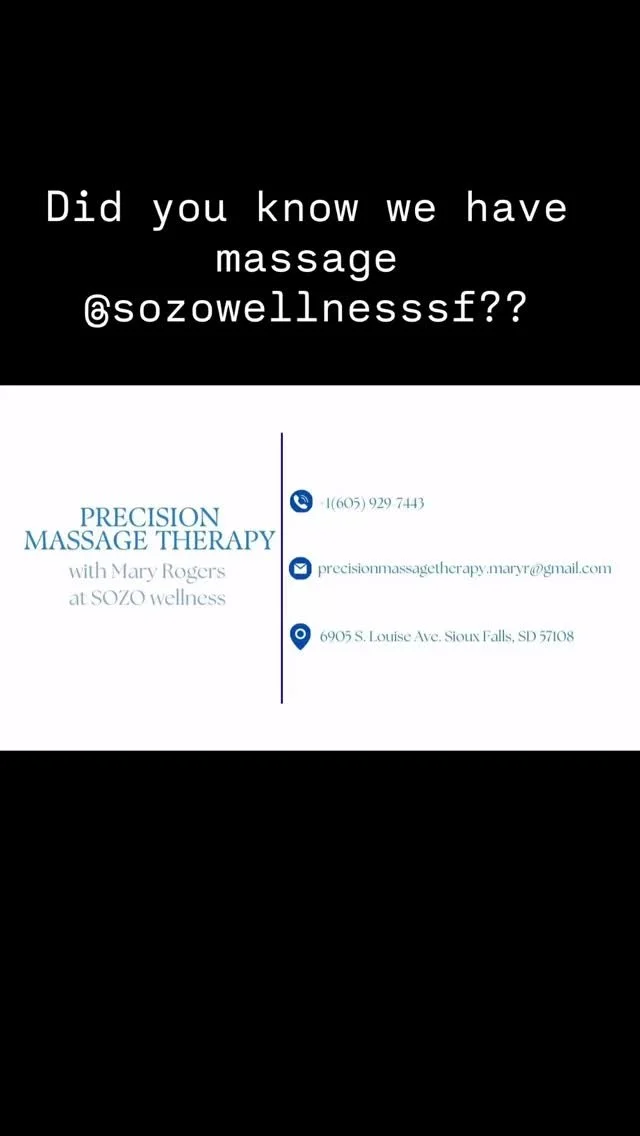 To add to SOZO’s diverse wellness offerings, we have partnered with Mary Rogers from Precision Massage Therapy to enhance client care with specialized massage techniques. Mary is a Licensed Massage Therapist and Professional Dancer based in Sioux Falls, South Dakota. Her extensive dance background provides a strong foundation in body mechanics, posture, and muscle health, which she integrates into her massage practice.