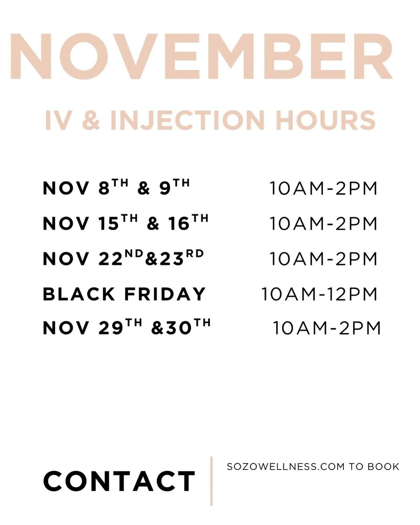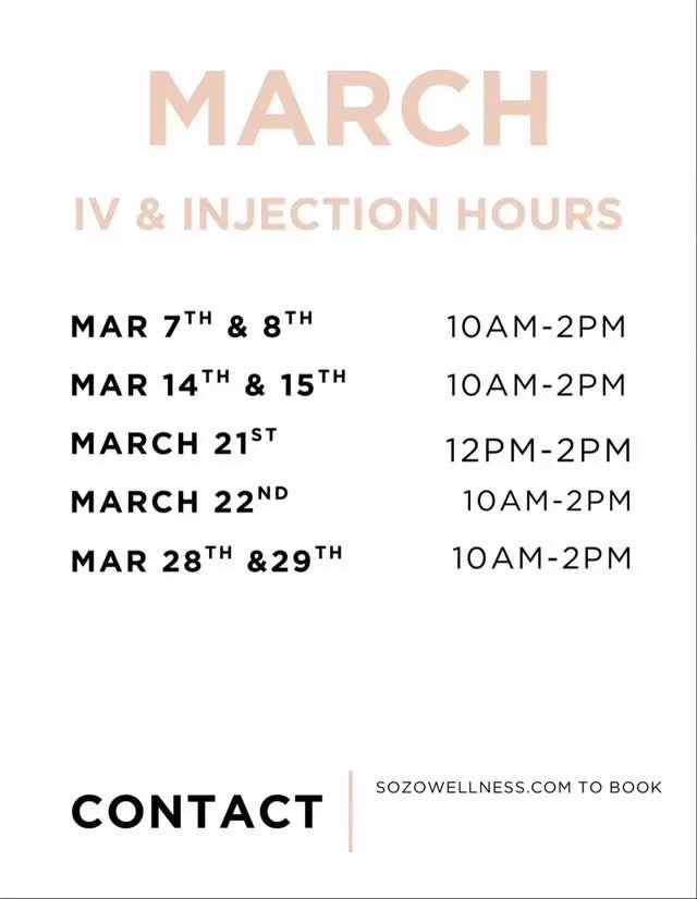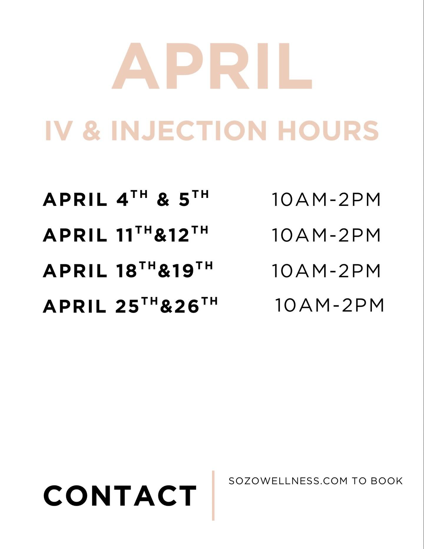 IV therapy, or intravenous therapy, is a medical technique that involves administering fluids, medications, and nutrients directly into a person’s vein. This method is commonly used for rehydration, providing nutrients, or administering medications and medical therapies like blood products or electrolytes to correct imbalances. The vitamin injections take approximately 15 minutes. The IV therapy takes 60 minutes. You will see only a 15 minute block of time on your scheduling page, but that is only due to limits of the scheduling system. Must be 18 years or older.